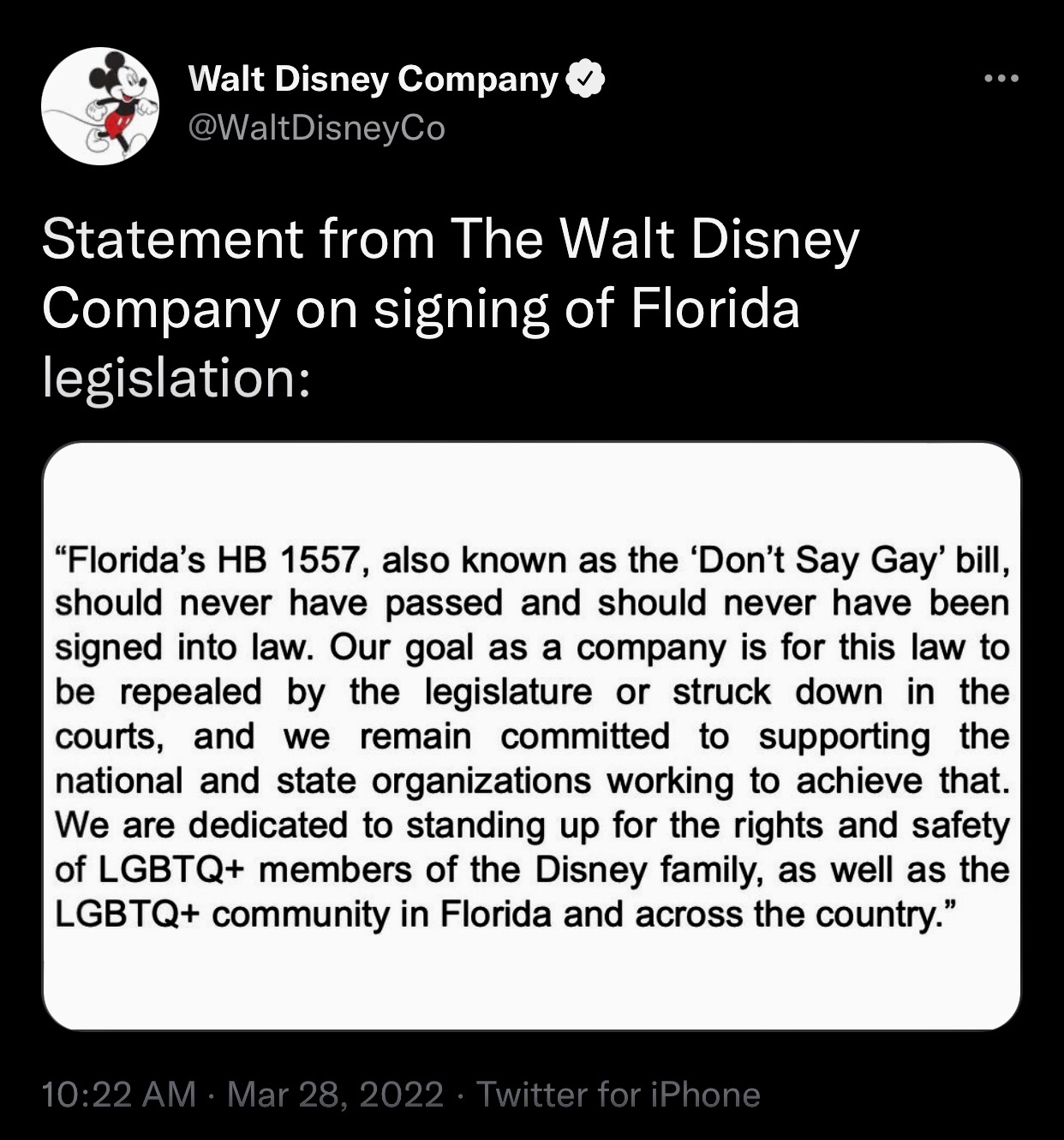 “Disney has always been a magical place for kids, and it still is,” said Chapek. “It is not, however, a magical place for bigots!!!”